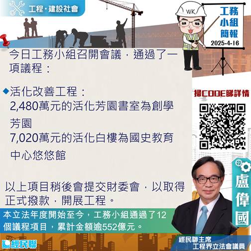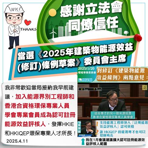 At the Buildings Energy Efficiency (Amendment) Bill 2025 meeting on 14 April, I was elected Chairman of the Bills Committee. The Bill seeks to amend the Buildings Energy Efficiency Ordinance and its subsidiary legislation to extend the scope of regulation to more types of buildings; to provide for the publication of certain technical information in energy audit reports; and to shorten the intervals of energy audit to be carried out in respect of specified buildings.