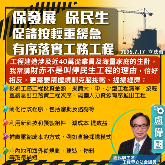 On 17 July, I moved an amendment on the motion of “Reviewing the priorities for public works to ensure enhanced speed and efficiency of key projects”. I urged the Government to further review and consolidate the existing list of large, medium and small-scale public works projects, assess the situation and implement various public works projects in an orderly manner according to their importance and urgency, consider deferring non-urgent projects, and optimize the allocation of public resources, so as to alleviate the financial pressure on the Government, avoid cutting expenditure related to people’s livelihood, and ensure more effective use of public resources, thereby enhancing the speed and efficiency of key projects relating to the economy and people’s well-being and bringing positive benefits to Hong Kong’s economy and people’s livelihood as soon as possible; when reviewing the list of public works projects, the Government should also strive to prevent drastic fluctuations in construction volume, so as to ensure the sustainable development of Hong Kong and safeguard the employment opportunities of construction practitioners. My amendment and the original motion were supported by the LegCo members.